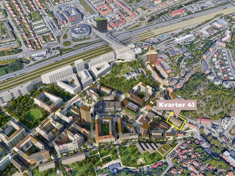 Kvarter 41 tar avstamp i platsens industrihistoria där färger och materialval är framtagna för att passa in i miljön. Byggnadens två trapphus skiljs åt i färgsättning och ger en effekt av två huskroppar, istället för en, vilket minskar skalan i arkitekturen.
